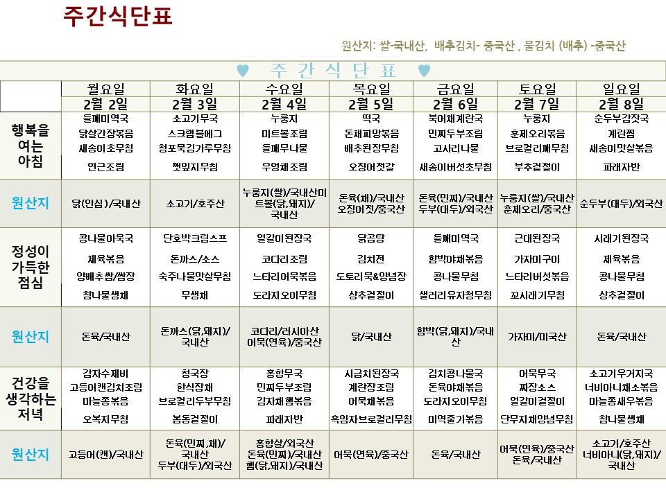 | → | 2026년 2월 2일 ~ 2026년 2월 8일 식단표 | 효성요양병원 | 2026-02-02 |