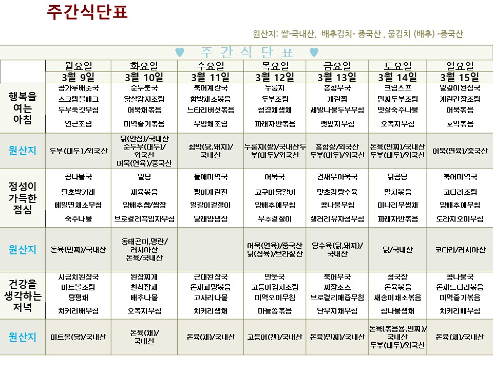 | → | 2026년 3월 9일 ~ 2026년 3월 15일 식단표 | 효성요양병원 | 2026-03-09 |