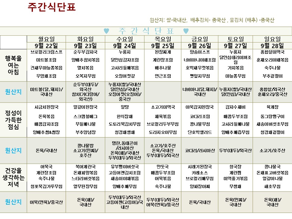 → | 2025년 9월 22일 ~ 2025년 9월 28일 식단표 | 효성요양병원 | 2025-09-22 |